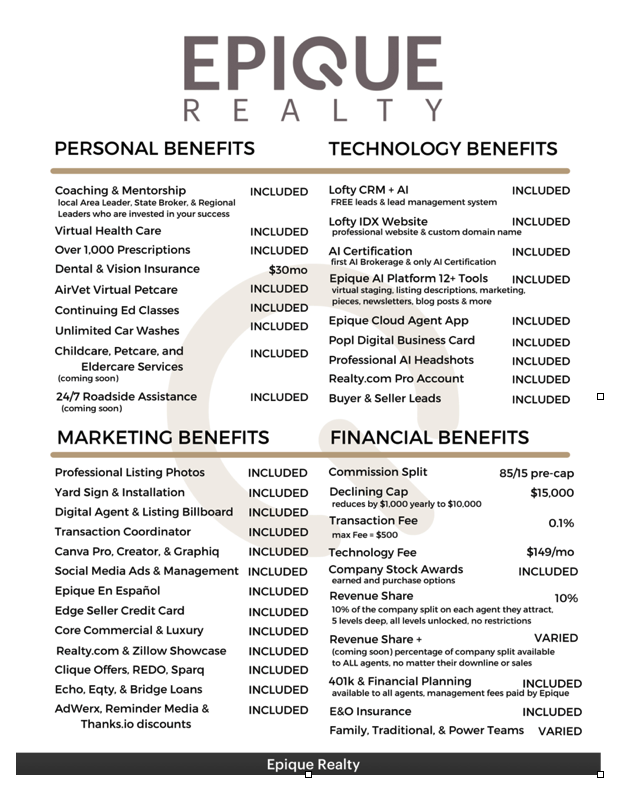 • Custom IDX website, “.com” domain, Canva PRO, Epique Card™, fee-free 401(k) and financial advisor.